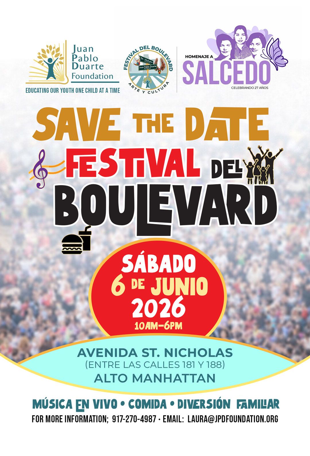 To be part of the party that brings approximately 10 thousand people per edition to the streets of Uptown Manhattan, please reach out to the Executive Director of JPD Foundation Laura Acosta. by telephone or WhatsApp on the number 917-270-4987 or by email at laura@jpdfoundation.org.