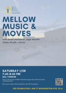 An invitation to move your body and relax your mind! The class will happen at the JPD Community Space on January 28th (last Saturday of the month) at 7:45pm.